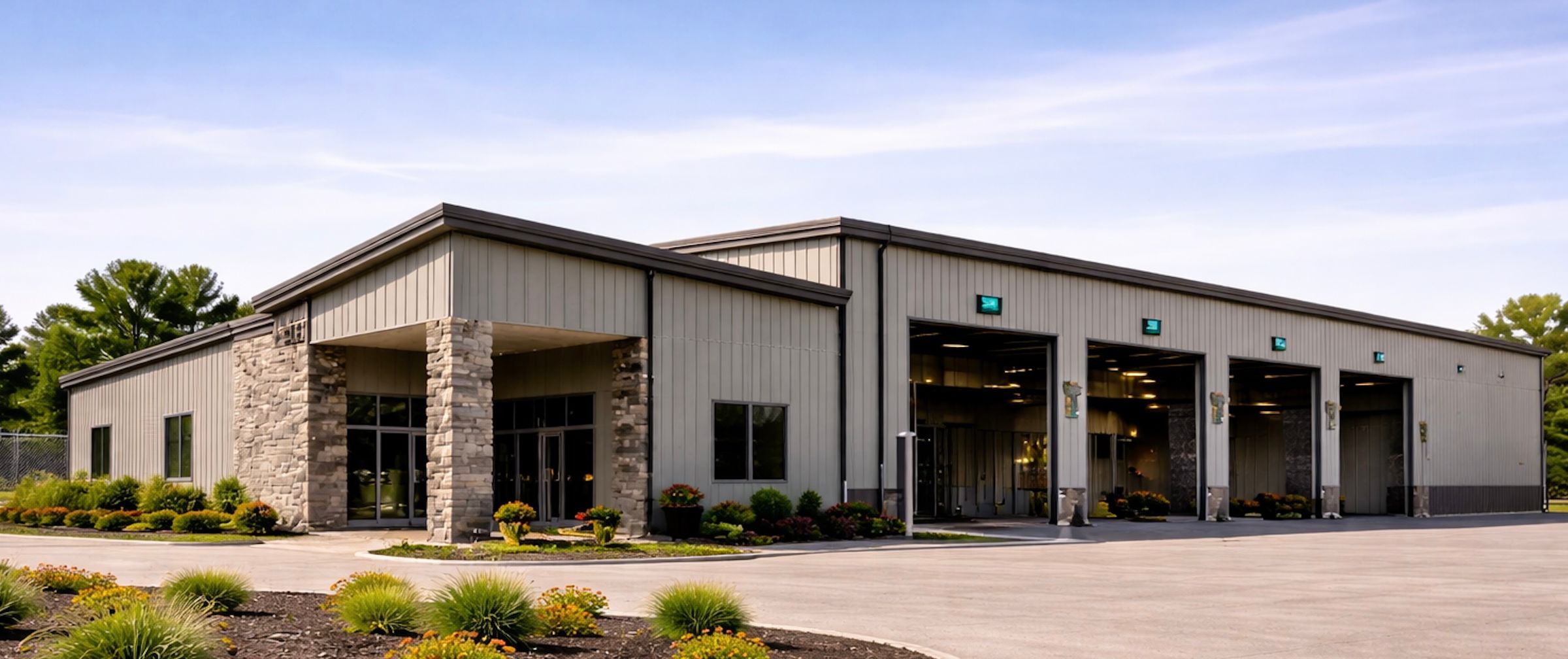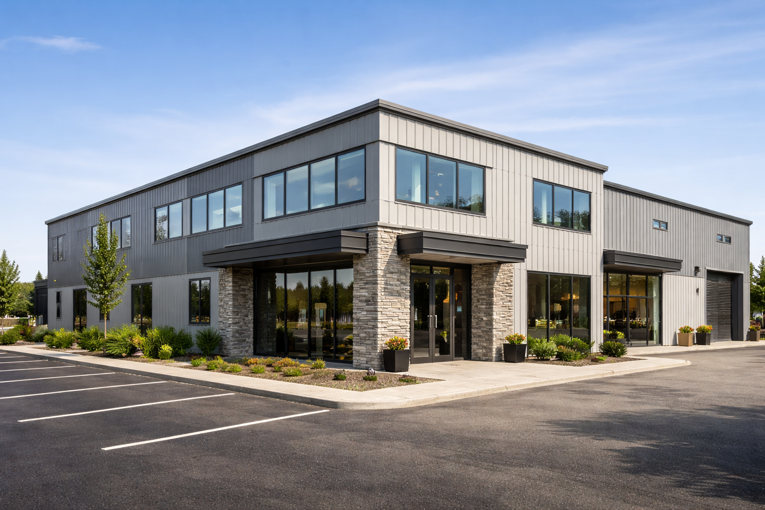 Modern metal buildings developed for commercial use, combining functionality, durability, and clean design