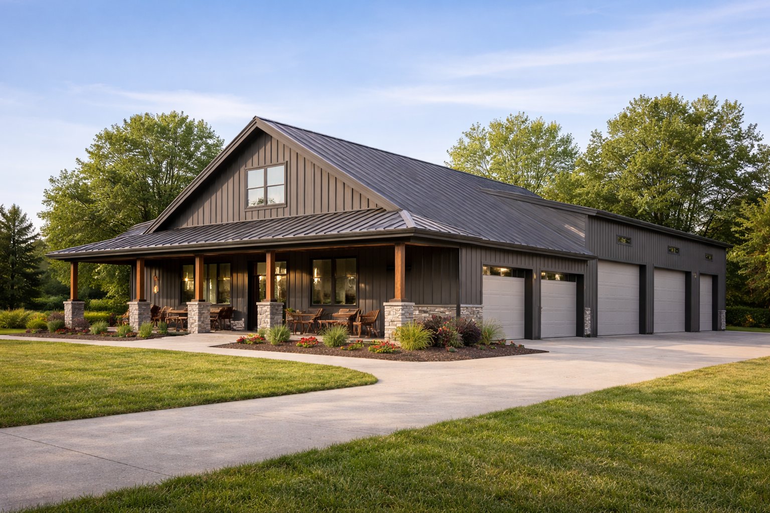 Steel structures for residential applications such as garages, workshops, and barndominiums